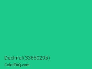 Decimal 33650295 Color is a normal green color and the nearest color is Mountain Meadow #30ba8f. Hex code #1ec98d and RGB value is rgb(30,201,141). In RGB color space, this color is composed of 12% red, 79% green, 55% blue, In CMYK color space, this color is composed of 85% cyan, 0% magenta, 30% yellow , 21% black , In HSL color space, this color has a hue angle of 159° , 74% saturation and 45% lightness.