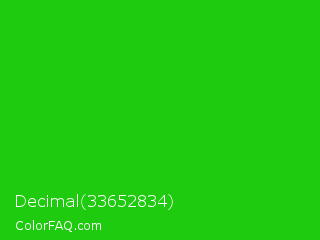 Decimal 33652834 Color is a normal green color and the nearest color is Lime Green #32cd32. Hex code #1ecb0e and RGB value is rgb(30,203,14). In RGB color space, this color is composed of 12% red, 80% green, 5% blue, In CMYK color space, this color is composed of 85% cyan, 0% magenta, 93% yellow , 20% black , In HSL color space, this color has a hue angle of 115° , 87% saturation and 43% lightness.