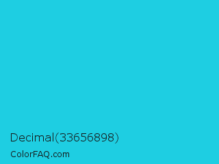 Decimal 33656898 Color is a normal cyan color and the nearest color is Scooter #2ebfd4. Hex code #1ecee2 and RGB value is rgb(30,206,226). In RGB color space, this color is composed of 12% red, 81% green, 89% blue, In CMYK color space, this color is composed of 87% cyan, 9% magenta, 0% yellow , 11% black , In HSL color space, this color has a hue angle of 186° , 77% saturation and 50% lightness.