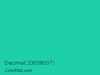 Decimal 33658007 Color is a normal cyan color and the nearest color is Shamrock #33cc99. Hex code #1ed0a9 and RGB value is rgb(30,208,169). In RGB color space, this color is composed of 12% red, 82% green, 66% blue, In CMYK color space, this color is composed of 86% cyan, 0% magenta, 19% yellow , 18% black , In HSL color space, this color has a hue angle of 167° , 75% saturation and 47% lightness.