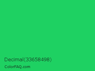 Decimal 33658498 Color is a normal green color and the nearest color is Malachite #0bda51. Hex code #1ed162 and RGB value is rgb(30,209,98). In RGB color space, this color is composed of 12% red, 82% green, 38% blue, In CMYK color space, this color is composed of 86% cyan, 0% magenta, 53% yellow , 18% black , In HSL color space, this color has a hue angle of 143° , 75% saturation and 47% lightness.