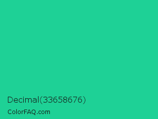 Decimal 33658676 Color is a normal green color and the nearest color is Shamrock #33cc99. Hex code #1ed196 and RGB value is rgb(30,209,150). In RGB color space, this color is composed of 12% red, 82% green, 59% blue, In CMYK color space, this color is composed of 86% cyan, 0% magenta, 28% yellow , 18% black , In HSL color space, this color has a hue angle of 160° , 75% saturation and 47% lightness.