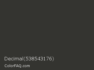 Decimal 538543176 Color is a very dark yellow color and the nearest color is Mine Shaft #323232. Hex code #343430 and RGB value is rgb(52,52,48). In RGB color space, this color is composed of 20% red, 20% green, 19% blue, In CMYK color space, this color is composed of 0% cyan, 0% magenta, 8% yellow , 80% black , In HSL color space, this color has a hue angle of 60° , 4% saturation and 20% lightness.