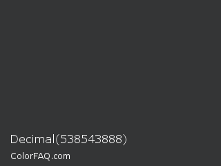 Decimal 538543888 Color is a very dark blue color and the nearest color is Jet #343434. Hex code #343536 and RGB value is rgb(52,53,54). In RGB color space, this color is composed of 20% red, 21% green, 21% blue, In CMYK color space, this color is composed of 4% cyan, 2% magenta, 0% yellow , 79% black , In HSL color space, this color has a hue angle of 210° , 2% saturation and 21% lightness.