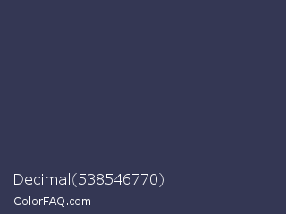 Decimal 538546770 Color is a dark blue color and the nearest color is Martinique #363050. Hex code #343754 and RGB value is rgb(52,55,84). In RGB color space, this color is composed of 20% red, 22% green, 33% blue, In CMYK color space, this color is composed of 38% cyan, 35% magenta, 0% yellow , 67% black , In HSL color space, this color has a hue angle of 234° , 24% saturation and 27% lightness.