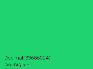 Decimal 33686024 Color is a normal green color and the nearest color is UFO Green #3cd070. Hex code #1ed370 and RGB value is rgb(30,211,112). In RGB color space, this color is composed of 12% red, 83% green, 44% blue, In CMYK color space, this color is composed of 86% cyan, 0% magenta, 47% yellow , 17% black , In HSL color space, this color has a hue angle of 147° , 75% saturation and 47% lightness.