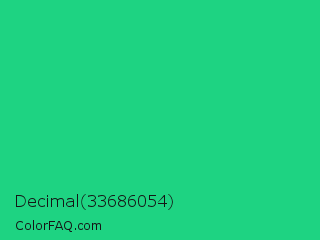 Decimal 33686054 Color is a normal green color and the nearest color is Shamrock #33cc99. Hex code #1ed382 and RGB value is rgb(30,211,130). In RGB color space, this color is composed of 12% red, 83% green, 51% blue, In CMYK color space, this color is composed of 86% cyan, 0% magenta, 38% yellow , 17% black , In HSL color space, this color has a hue angle of 153° , 75% saturation and 47% lightness.