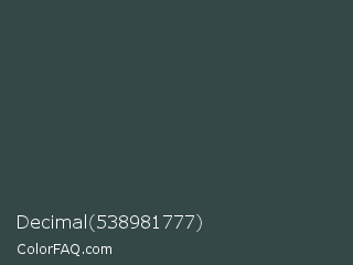 Decimal 538981777 Color is a dark cyan color and the nearest color is Charcoal #36454f. Hex code #344847 and RGB value is rgb(52,72,71). In RGB color space, this color is composed of 20% red, 28% green, 28% blue, In CMYK color space, this color is composed of 28% cyan, 0% magenta, 1% yellow , 72% black , In HSL color space, this color has a hue angle of 177° , 16% saturation and 24% lightness.