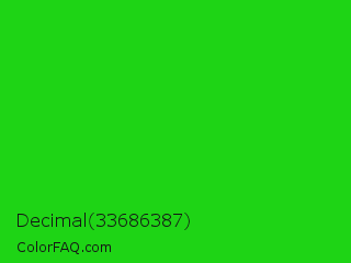 Decimal 33686387 Color is a normal green color and the nearest color is Lime Green #32cd32. Hex code #1ed415 and RGB value is rgb(30,212,21). In RGB color space, this color is composed of 12% red, 83% green, 8% blue, In CMYK color space, this color is composed of 86% cyan, 0% magenta, 90% yellow , 17% black , In HSL color space, this color has a hue angle of 117° , 82% saturation and 46% lightness.