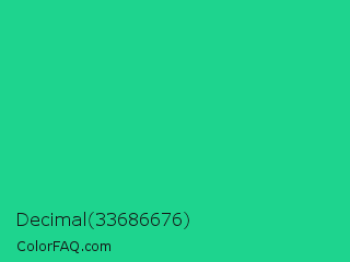 Decimal 33686676 Color is a normal green color and the nearest color is Shamrock #33cc99. Hex code #1ed48e and RGB value is rgb(30,212,142). In RGB color space, this color is composed of 12% red, 83% green, 56% blue, In CMYK color space, this color is composed of 86% cyan, 0% magenta, 33% yellow , 17% black , In HSL color space, this color has a hue angle of 157° , 75% saturation and 47% lightness.