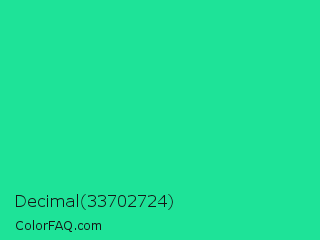 Decimal 33702724 Color is a normal green color and the nearest color is Shamrock #33cc99. Hex code #1ee398 and RGB value is rgb(30,227,152). In RGB color space, this color is composed of 12% red, 89% green, 60% blue, In CMYK color space, this color is composed of 87% cyan, 0% magenta, 33% yellow , 11% black , In HSL color space, this color has a hue angle of 157° , 78% saturation and 50% lightness.