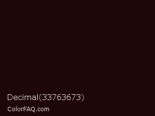 Decimal 33763673 Color is a almost black red color and the nearest color is Kilamanjaro #240c02. Hex code #1f0607 and RGB value is rgb(31,6,7). In RGB color space, this color is composed of 12% red, 2% green, 3% blue, In CMYK color space, this color is composed of 0% cyan, 81% magenta, 77% yellow , 88% black , In HSL color space, this color has a hue angle of 358° , 68% saturation and 7% lightness.
