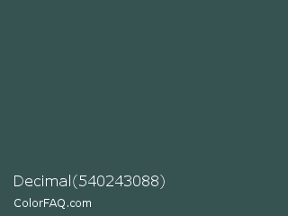 Decimal 540243088 Color is a dark cyan color and the nearest color is Dark Slate Gray #2f4f4f. Hex code #365352 and RGB value is rgb(54,83,82). In RGB color space, this color is composed of 21% red, 33% green, 32% blue, In CMYK color space, this color is composed of 35% cyan, 0% magenta, 1% yellow , 67% black , In HSL color space, this color has a hue angle of 178° , 21% saturation and 27% lightness.