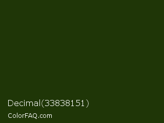 Decimal 33838151 Color is a very dark green color and the nearest color is Palm Leaf #19330e. Hex code #1f3607 and RGB value is rgb(31,54,7). In RGB color space, this color is composed of 12% red, 21% green, 3% blue, In CMYK color space, this color is composed of 43% cyan, 0% magenta, 87% yellow , 79% black , In HSL color space, this color has a hue angle of 89° , 77% saturation and 12% lightness.