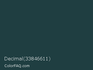 Decimal 33846611 Color is a very dark cyan color and the nearest color is Te Papa Green #1e433c. Hex code #1f3e41 and RGB value is rgb(31,62,65). In RGB color space, this color is composed of 12% red, 24% green, 25% blue, In CMYK color space, this color is composed of 52% cyan, 5% magenta, 0% yellow , 75% black , In HSL color space, this color has a hue angle of 185° , 35% saturation and 19% lightness.