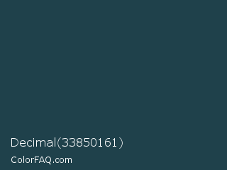 Decimal 33850161 Color is a very dark blue color and the nearest color is Japanese Indigo #264348. Hex code #1f414b and RGB value is rgb(31,65,75). In RGB color space, this color is composed of 12% red, 25% green, 29% blue, In CMYK color space, this color is composed of 59% cyan, 13% magenta, 0% yellow , 71% black , In HSL color space, this color has a hue angle of 194° , 42% saturation and 21% lightness.