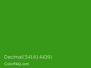 Decimal 541614439 Color is a normal green color and the nearest color is Slimy Green #299617. Hex code #389817 and RGB value is rgb(56,152,23). In RGB color space, this color is composed of 22% red, 60% green, 9% blue, In CMYK color space, this color is composed of 63% cyan, 0% magenta, 85% yellow , 40% black , In HSL color space, this color has a hue angle of 105° , 74% saturation and 34% lightness.