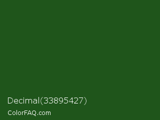 Decimal 33895427 Color is a very dark green color and the nearest color is Parsley #134f19. Hex code #1f551b and RGB value is rgb(31,85,27). In RGB color space, this color is composed of 12% red, 33% green, 11% blue, In CMYK color space, this color is composed of 64% cyan, 0% magenta, 68% yellow , 67% black , In HSL color space, this color has a hue angle of 116° , 52% saturation and 22% lightness.