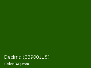 Decimal 33900118 Color is a very dark green color and the nearest color is Lincoln Green #195905. Hex code #1f5a00 and RGB value is rgb(31,90,0). In RGB color space, this color is composed of 12% red, 35% green, 0% blue, In CMYK color space, this color is composed of 66% cyan, 0% magenta, 100% yellow , 65% black , In HSL color space, this color has a hue angle of 99° , 100% saturation and 18% lightness.