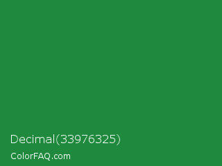 Decimal 33976325 Color is a normal green color and the nearest color is Dark Spring Green #177245. Hex code #1f8a3d and RGB value is rgb(31,138,61). In RGB color space, this color is composed of 12% red, 54% green, 24% blue, In CMYK color space, this color is composed of 78% cyan, 0% magenta, 56% yellow , 46% black , In HSL color space, this color has a hue angle of 137° , 63% saturation and 33% lightness.