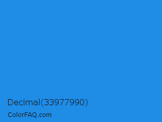 Decimal 33977990 Color is a normal blue color and the nearest color is Bleu De France #318ce7. Hex code #1f8ce6 and RGB value is rgb(31,140,230). In RGB color space, this color is composed of 12% red, 55% green, 90% blue, In CMYK color space, this color is composed of 87% cyan, 39% magenta, 0% yellow , 10% black , In HSL color space, this color has a hue angle of 207° , 80% saturation and 51% lightness.