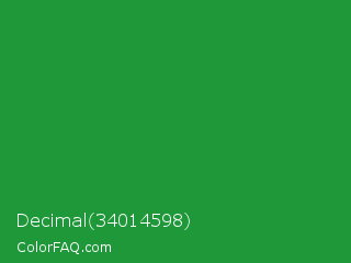 Decimal 34014598 Color is a normal green color and the nearest color is Forest Green #228b22. Hex code #1f983a and RGB value is rgb(31,152,58). In RGB color space, this color is composed of 12% red, 60% green, 23% blue, In CMYK color space, this color is composed of 80% cyan, 0% magenta, 62% yellow , 40% black , In HSL color space, this color has a hue angle of 133° , 66% saturation and 36% lightness.