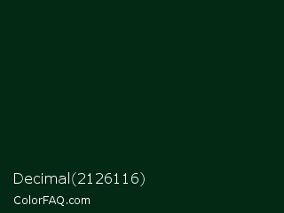 Decimal 2126116 Color is a almost black green color and the nearest color is English Holly #022d15. Hex code #032914 and RGB value is rgb(3,41,20). In RGB color space, this color is composed of 1% red, 16% green, 8% blue, In CMYK color space, this color is composed of 93% cyan, 0% magenta, 51% yellow , 84% black , In HSL color space, this color has a hue angle of 147° , 86% saturation and 9% lightness.