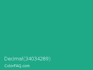 Decimal 34034289 Color is a normal cyan color and the nearest color is Jungle Green #29ab87. Hex code #1faa87 and RGB value is rgb(31,170,135). In RGB color space, this color is composed of 12% red, 67% green, 53% blue, In CMYK color space, this color is composed of 82% cyan, 0% magenta, 21% yellow , 33% black , In HSL color space, this color has a hue angle of 165° , 69% saturation and 39% lightness.