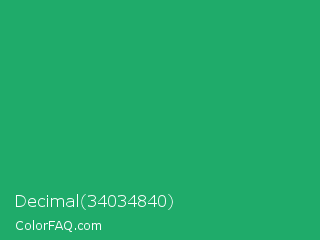 Decimal 34034840 Color is a normal green color and the nearest color is Green Crayola #1cac78. Hex code #1fab6a and RGB value is rgb(31,171,106). In RGB color space, this color is composed of 12% red, 67% green, 42% blue, In CMYK color space, this color is composed of 82% cyan, 0% magenta, 38% yellow , 33% black , In HSL color space, this color has a hue angle of 152° , 69% saturation and 40% lightness.