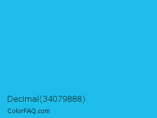 Decimal 34079888 Color is a normal cyan color and the nearest color is Spiro Disco Ball #0fc0fc. Hex code #1fbeea and RGB value is rgb(31,190,234). In RGB color space, this color is composed of 12% red, 75% green, 92% blue, In CMYK color space, this color is composed of 87% cyan, 19% magenta, 0% yellow , 8% black , In HSL color space, this color has a hue angle of 193° , 83% saturation and 52% lightness.