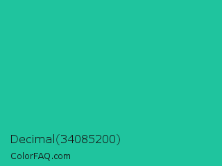 Decimal 34085200 Color is a normal cyan color and the nearest color is Light Sea Green #20b2aa. Hex code #1fc49e and RGB value is rgb(31,196,158). In RGB color space, this color is composed of 12% red, 77% green, 62% blue, In CMYK color space, this color is composed of 84% cyan, 0% magenta, 19% yellow , 23% black , In HSL color space, this color has a hue angle of 166° , 73% saturation and 45% lightness.