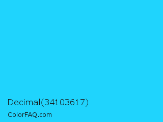 Decimal 34103617 Color is a normal cyan color and the nearest color is Spiro Disco Ball #0fc0fc. Hex code #1fd4fd and RGB value is rgb(31,212,253). In RGB color space, this color is composed of 12% red, 83% green, 99% blue, In CMYK color space, this color is composed of 88% cyan, 16% magenta, 0% yellow , 1% black , In HSL color space, this color has a hue angle of 191° , 98% saturation and 56% lightness.