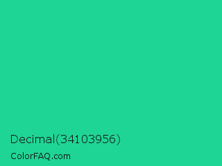 Decimal 34103956 Color is a normal green color and the nearest color is Shamrock #33cc99. Hex code #1fd596 and RGB value is rgb(31,213,150). In RGB color space, this color is composed of 12% red, 84% green, 59% blue, In CMYK color space, this color is composed of 85% cyan, 0% magenta, 30% yellow , 16% black , In HSL color space, this color has a hue angle of 159° , 75% saturation and 48% lightness.