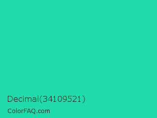 Decimal 34109521 Color is a normal cyan color and the nearest color is Shamrock #33cc99. Hex code #1fdbab and RGB value is rgb(31,219,171). In RGB color space, this color is composed of 12% red, 86% green, 67% blue, In CMYK color space, this color is composed of 86% cyan, 0% magenta, 22% yellow , 14% black , In HSL color space, this color has a hue angle of 165° , 75% saturation and 49% lightness.