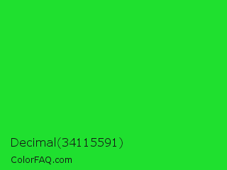 Decimal 34115591 Color is a normal green color and the nearest color is Lime Green #32cd32. Hex code #1fe02f and RGB value is rgb(31,224,47). In RGB color space, this color is composed of 12% red, 88% green, 18% blue, In CMYK color space, this color is composed of 86% cyan, 0% magenta, 79% yellow , 12% black , In HSL color space, this color has a hue angle of 125° , 76% saturation and 50% lightness.