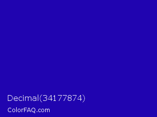 Decimal 34177874 Color is a normal indigo color and the nearest color is Ultramarine #120a8f. Hex code #2004b0 and RGB value is rgb(32,4,176). In RGB color space, this color is composed of 13% red, 2% green, 69% blue, In CMYK color space, this color is composed of 82% cyan, 98% magenta, 0% yellow , 31% black , In HSL color space, this color has a hue angle of 250° , 96% saturation and 35% lightness.