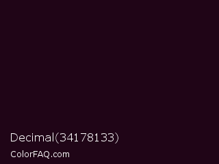 Decimal 34178133 Color is a almost black magenta color and the nearest color is Licorice #1a1110. Hex code #200517 and RGB value is rgb(32,5,23). In RGB color space, this color is composed of 13% red, 2% green, 9% blue, In CMYK color space, this color is composed of 0% cyan, 84% magenta, 28% yellow , 87% black , In HSL color space, this color has a hue angle of 320° , 73% saturation and 7% lightness.