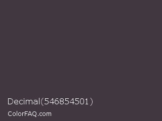 Decimal 546854501 Color is a dark magenta color and the nearest color is Ship Gray #3e3a44. Hex code #403741 and RGB value is rgb(64,55,65). In RGB color space, this color is composed of 25% red, 22% green, 25% blue, In CMYK color space, this color is composed of 2% cyan, 15% magenta, 0% yellow , 75% black , In HSL color space, this color has a hue angle of 294° , 8% saturation and 24% lightness.