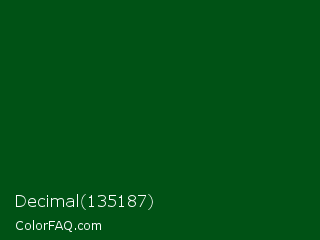 Decimal 135187 Color is a very dark green color and the nearest color is Camarone #00581a. Hex code #005215 and RGB value is rgb(0,82,21). In RGB color space, this color is composed of 0% red, 32% green, 8% blue, In CMYK color space, this color is composed of 100% cyan, 0% magenta, 74% yellow , 68% black , In HSL color space, this color has a hue angle of 135° , 100% saturation and 16% lightness.