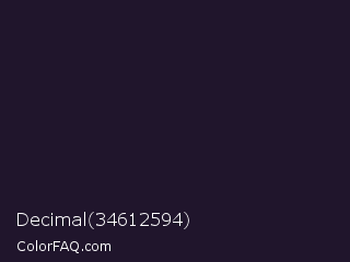 Decimal 34612594 Color is a very dark violet color and the nearest color is Haiti #1b1035. Hex code #20152c and RGB value is rgb(32,21,44). In RGB color space, this color is composed of 13% red, 8% green, 17% blue, In CMYK color space, this color is composed of 27% cyan, 52% magenta, 0% yellow , 83% black , In HSL color space, this color has a hue angle of 269° , 35% saturation and 13% lightness.