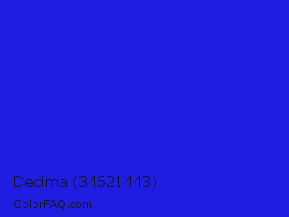 Decimal 34621443 Color is a normal indigo color and the nearest color is Bluebonnet #1c1cf0. Hex code #201de3 and RGB value is rgb(32,29,227). In RGB color space, this color is composed of 13% red, 11% green, 89% blue, In CMYK color space, this color is composed of 86% cyan, 87% magenta, 0% yellow , 11% black , In HSL color space, this color has a hue angle of 241° , 78% saturation and 50% lightness.