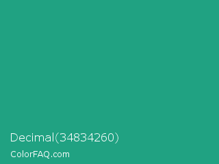 Decimal 34834260 Color is a normal cyan color and the nearest color is Jungle Green #29ab87. Hex code #20a282 and RGB value is rgb(32,162,130). In RGB color space, this color is composed of 13% red, 64% green, 51% blue, In CMYK color space, this color is composed of 80% cyan, 0% magenta, 20% yellow , 36% black , In HSL color space, this color has a hue angle of 165° , 67% saturation and 38% lightness.