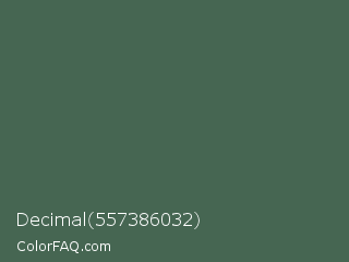 Decimal 557386032 Color is a normal green color and the nearest color is Nandor #4b5d52. Hex code #466652 and RGB value is rgb(70,102,82). In RGB color space, this color is composed of 27% red, 40% green, 32% blue, In CMYK color space, this color is composed of 31% cyan, 0% magenta, 20% yellow , 60% black , In HSL color space, this color has a hue angle of 143° , 19% saturation and 34% lightness.