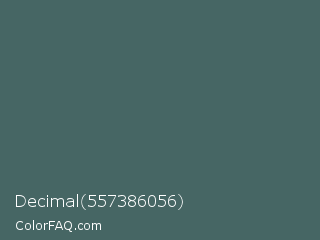 Decimal 557386056 Color is a normal cyan color and the nearest color is Deep Space Sparkle #4a646c. Hex code #466664 and RGB value is rgb(70,102,100). In RGB color space, this color is composed of 27% red, 40% green, 39% blue, In CMYK color space, this color is composed of 31% cyan, 0% magenta, 2% yellow , 60% black , In HSL color space, this color has a hue angle of 176° , 19% saturation and 34% lightness.