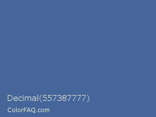 Decimal 557387777 Color is a normal blue color and the nearest color is Queen Blue #436b95. Hex code #466699 and RGB value is rgb(70,102,153). In RGB color space, this color is composed of 27% red, 40% green, 60% blue, In CMYK color space, this color is composed of 54% cyan, 33% magenta, 0% yellow , 40% black , In HSL color space, this color has a hue angle of 217° , 37% saturation and 44% lightness.