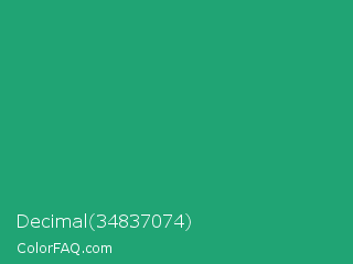 Decimal 34837074 Color is a normal green color and the nearest color is Green Crayola #1cac78. Hex code #20a474 and RGB value is rgb(32,164,116). In RGB color space, this color is composed of 13% red, 64% green, 45% blue, In CMYK color space, this color is composed of 80% cyan, 0% magenta, 29% yellow , 36% black , In HSL color space, this color has a hue angle of 158° , 67% saturation and 38% lightness.
