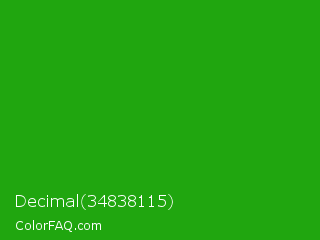 Decimal 34838115 Color is a normal green color and the nearest color is Slimy Green #299617. Hex code #20a60f and RGB value is rgb(32,166,15). In RGB color space, this color is composed of 13% red, 65% green, 6% blue, In CMYK color space, this color is composed of 81% cyan, 0% magenta, 91% yellow , 35% black , In HSL color space, this color has a hue angle of 113° , 83% saturation and 35% lightness.