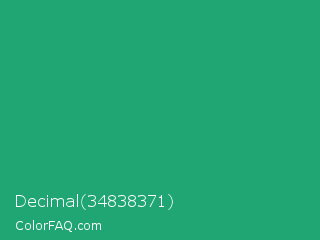 Decimal 34838371 Color is a normal green color and the nearest color is Green Crayola #1cac78. Hex code #20a673 and RGB value is rgb(32,166,115). In RGB color space, this color is composed of 13% red, 65% green, 45% blue, In CMYK color space, this color is composed of 81% cyan, 0% magenta, 31% yellow , 35% black , In HSL color space, this color has a hue angle of 157° , 68% saturation and 39% lightness.
