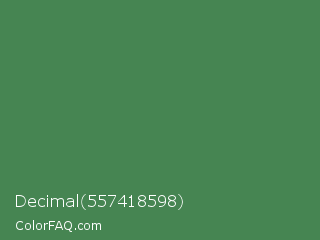 Decimal 557418598 Color is a normal green color and the nearest color is Middle Green #4d8c57. Hex code #468552 and RGB value is rgb(70,133,82). In RGB color space, this color is composed of 27% red, 52% green, 32% blue, In CMYK color space, this color is composed of 47% cyan, 0% magenta, 38% yellow , 48% black , In HSL color space, this color has a hue angle of 131° , 31% saturation and 40% lightness.
