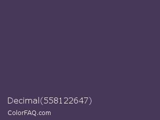 Decimal 558122647 Color is a dark violet color and the nearest color is Gun Powder #414257. Hex code #473859 and RGB value is rgb(71,56,89). In RGB color space, this color is composed of 28% red, 22% green, 35% blue, In CMYK color space, this color is composed of 20% cyan, 37% magenta, 0% yellow , 65% black , In HSL color space, this color has a hue angle of 267° , 23% saturation and 28% lightness.